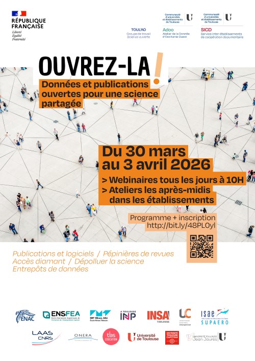 Du lundi 30 mars au vendredi 3 avril 2026, le réseau des bibliothèques, le SICD et l'Atelier de la donnée en Occitanie ouest (ADOO) porté par la Communauté d’universités et établissements de Toulouse, organisent une semaine d’échanges et de découvertes autour des données et publications ouvertes.